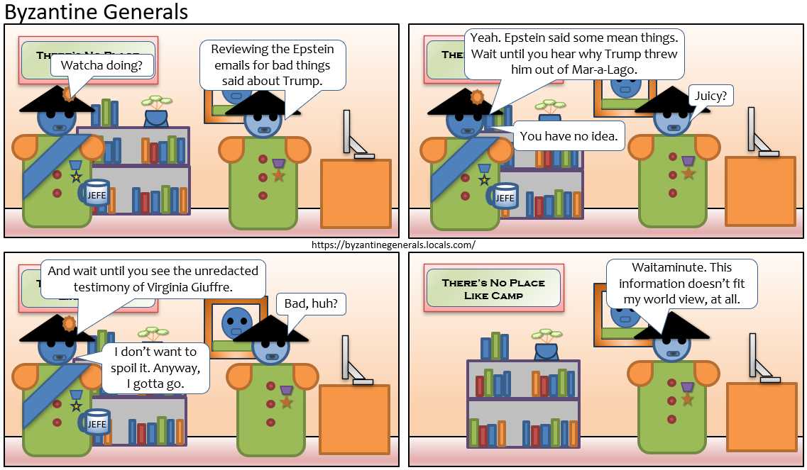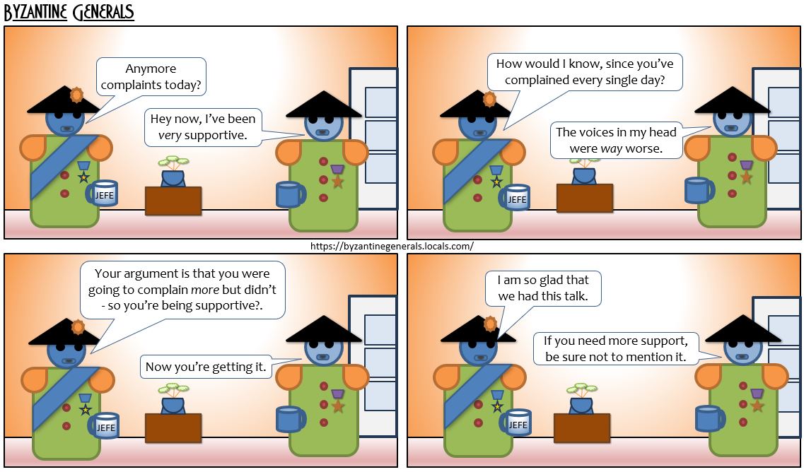 This is the home for my Byzantine Generals comics. The "Byzantine General" problem is a problem in computer science in how to deal with incorrect or incomplete information - while still operating reliably, and is a facet of distributed ledger technology.